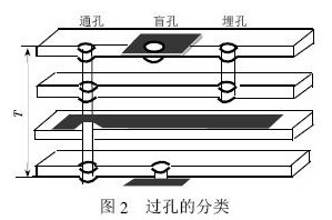 通孔,這種孔穿過整個(gè)線路板,可用于實(shí)現(xiàn)內(nèi)部互連或作為元件的安裝定位孔。由于通孔在工藝上更易于實(shí)現(xiàn),成本較低,所以一般印制電路板均使用通孔。過孔的分類如圖2 所示。